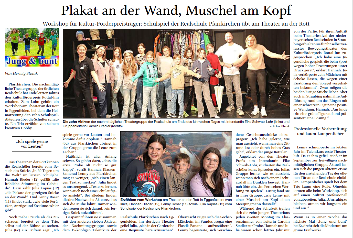 Als Gewinner des Kulturförderpreises Rottal-Inn durften zehn junge Nachwuchsschauspieler der Realschule Pfarrkirchen Anfang März ihr Können und Wissen, mit professioneller Begleitung von Intendantin Elke Maria Schwab-Lohr und Schauspieler Eduard Zhukov, erweitern. Dazu berichtete die PNP im Lokalteil Pfarrkirchen-Simbach am 12.3.2026: